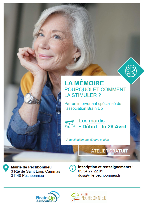 Dans le cadre des actions municipales menées à destination des seniors, la Ville, en partenariat avec le Conseil départemental et l’association Brain Up, vous propose un atelier « Entraîner sa mémoire tout en prenant plaisir » au cours duquel vous apprendrez les méthodes et les techniques pour entraîner et préserver votre mémoire. Ouvert à tous, il est avant tout un moment de plaisir et de convivialité. Vous aurez notamment l’occasion d’échanger et travailler votre mémoire grâce à des jeux d’attention et d’observation, à des exercices de logique et de vocabulaire. Ce sera aussi un moment pour partager vos expériences de vie et être conseillé par un professionnel en psychologie qui répondra à toutes vos questions sur le fonctionnement de la mémoire et sur les effets de l’âge