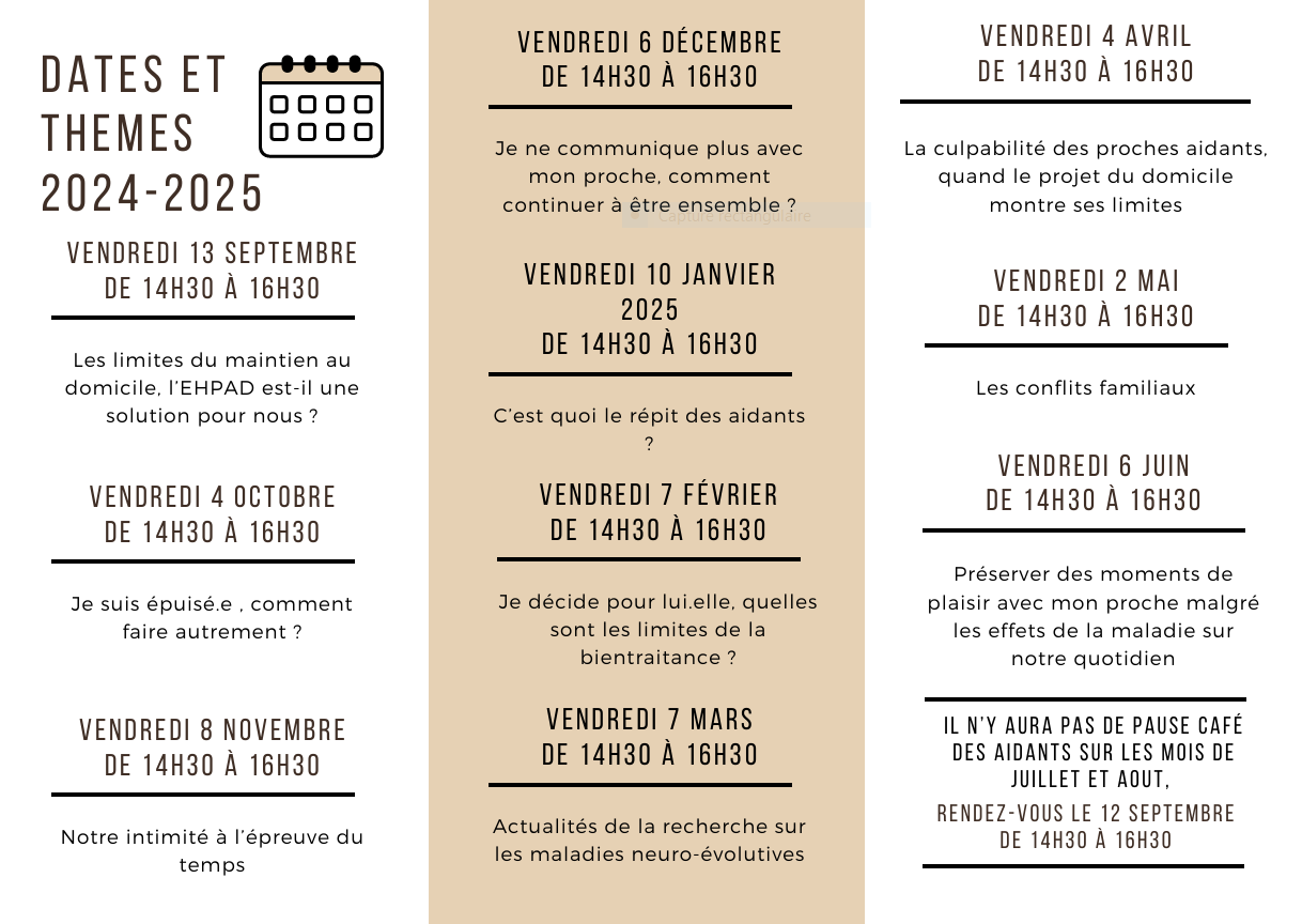 Afin de répondre au besoin de proximité des aidants, la « pause-café des aidants » vous est proposée à l’initiative de la plateforme des aidants de l’Association Familiale Intercantonale ainsi que de la municipalité. Ces pauses café mensuelles sont destinées aux proches de personnes atteintes par des maladies neurodégénératives. Ces rencontres se déroulent à la salle Simone Veil, place de la Liberté, un lieu de rencontre convivial et neutre, déconnecté de la maladie et de la dépendance.