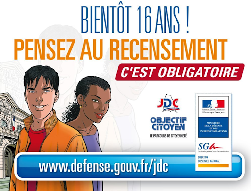 A partir de 16 ans (et dans les 3 mois qui suivent votre anniversaire), filles et garçons, vous devez effectuer votre recensement citoyen ou militaire : il vous permettra en particulier d’être convoqué à la Journée Défense et Citoyenneté (JDC).