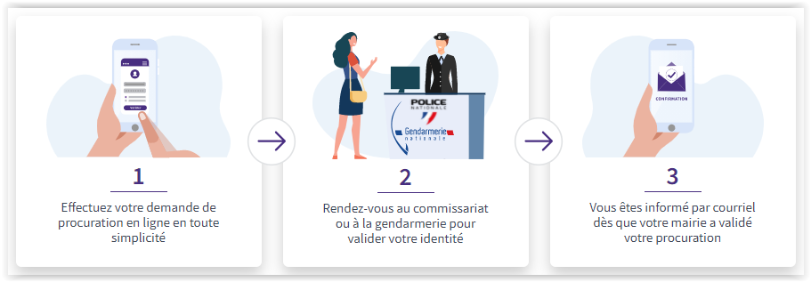 Un seul passage en brigade de Gendarmerie nationale ou en commissariat de Police Nationale est nécessaire pour valider votre procuration.