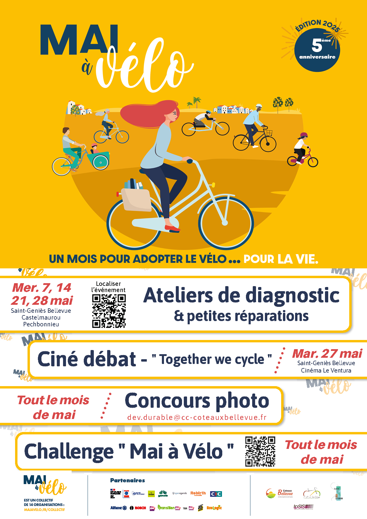 Tout le mois de mai, le territoire des Coteaux Bellevue célèbre le vélo sous toutes ses formes à travers l’événement Mai à Vélo. Ateliers pratiques, temps forts culturels, défis sportifs et créativité sont au rendez-vous !
