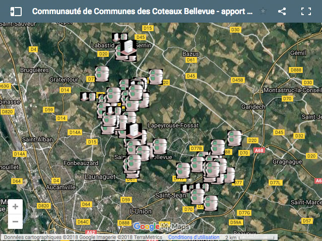 Pour les verres : chemin Bellevue, place du 19 mars, chemin de Turtelle, clos de Barat, ZA le Grand, parking salle des fêtes, cimetière ch. de Labastidole, les Caudeyrous, chemin Panchaud, parking Carrefour Market, rue de Grèce et chemin Moureau.