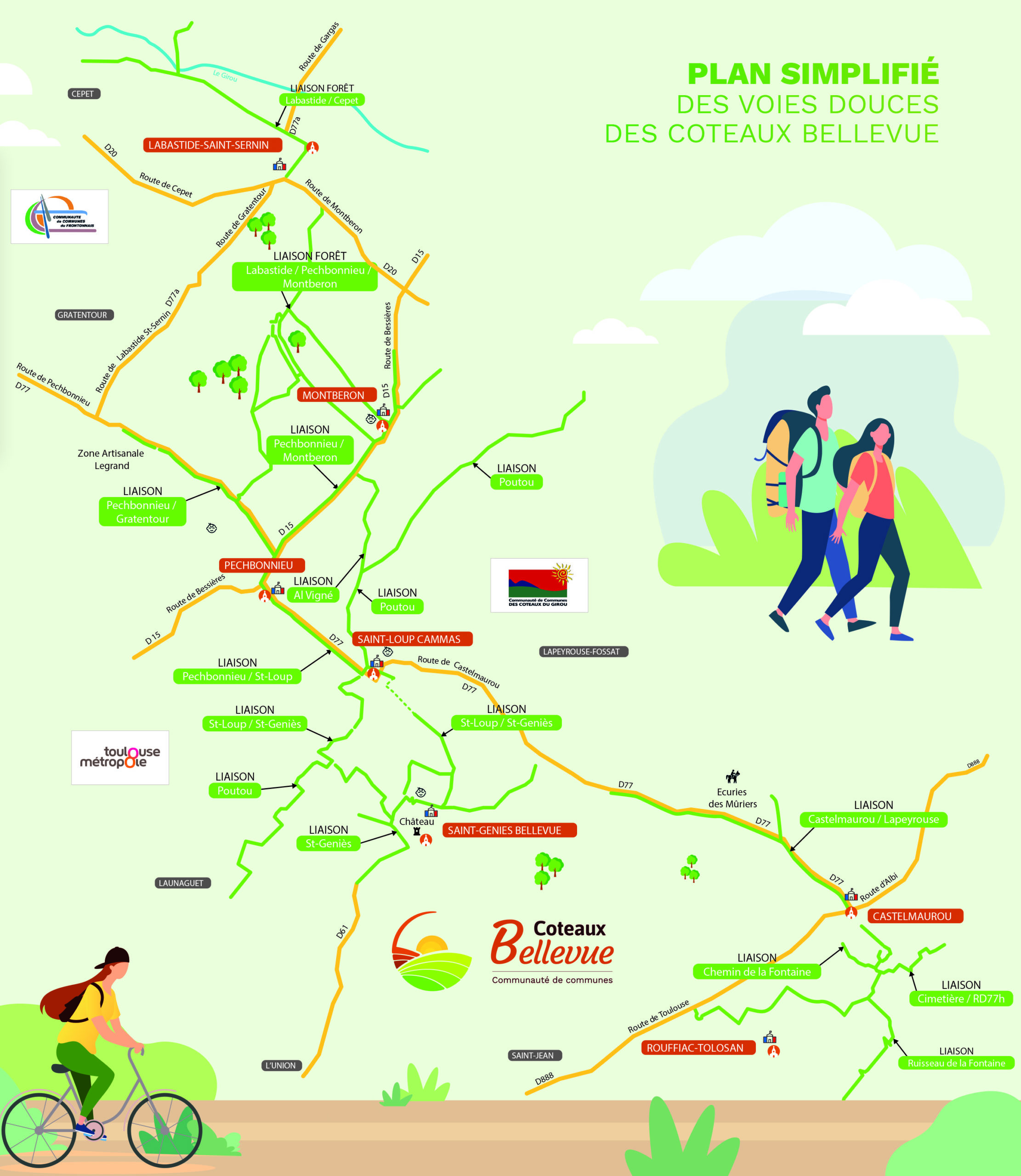 La Communauté de Communes des Coteaux Bellevue continue d’œuvrer au maillage de son territoire à l’aide de voies douces, pistes cyclables et cheminements mixtes. Dans ce cadre, une étude globale a été réalisée en 2018 pour définir une vision à long terme des différents tronçons envisageables ; l’objectif de ces aménagements étant de relier les sept communes de la CCCB pour favoriser les déplacements doux en créant des voies pédestres et cyclables. Les coûts d’aménagements sont très onéreux et pour ne pas trop impacter le budget, les travaux sont échelonnés sur plusieurs années. Afin d’atteindre notre objectif de liaison globale, les travaux ont été programmés jusqu’en 2026. Ces aménagements nous permettront également de pouvoir relier les deux prochains axes 8 et 9 du REV (Réseau Express Vélo) et de rejoindre Toulouse Métropole à vélo et en toute sécurité.
